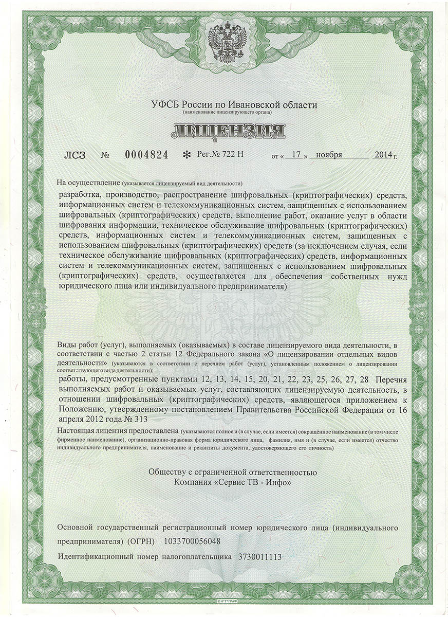 Лицензия ФСБ № 0004824 от 17.11.2014